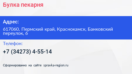 Булка, пекарня по адресу 617060, Пермский край, Краснокамск, Банковский переулок, 6 в дальнейшем Организация, размещена в следующих категориях: