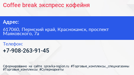 Coffee-break, экспресс-кофейня по адресу 617060, Пермский край, Краснокамск, проспект Маяковского, 7а в дальнейшем Организация, размещена в следующих категориях: