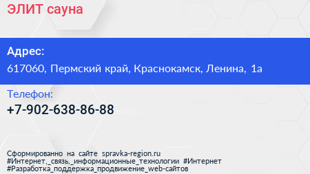 ЭЛИТ, сауна по адресу 617060, Пермский край, Краснокамск, Ленина, 1а в дальнейшем Организация, размещена в следующих категориях: