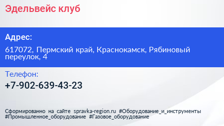 Эдельвейс, клуб по адресу 617072, Пермский край, Краснокамск, Рябиновый переулок, 4 в дальнейшем Организация, размещена в следующих категориях: