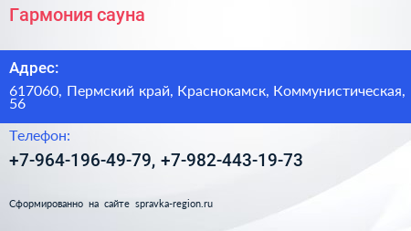 Гармония, сауна по адресу 617060, Пермский край, Краснокамск, Коммунистическая, 56 в дальнейшем Организация, размещена в следующих категориях: