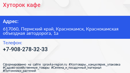 Хуторок, кафе по адресу 617060, Пермский край, Краснокамск, Краснокамская объездная автодорога, 1а в дальнейшем Организация, размещена в следующих категориях: