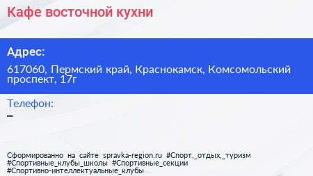 Кафе восточной кухни по адресу 617060, Пермский край, Краснокамск, Комсомольский проспект, 17г в дальнейшем Организация, размещена в следующих категориях:
