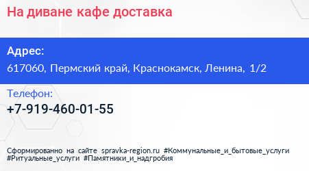 На диване, кафе-доставка по адресу 617060, Пермский край, Краснокамск, Ленина, 1/2 в дальнейшем Организация, размещена в следующих категориях: