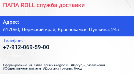 ПАПА ROLL, служба доставки по адресу 617060, Пермский край, Краснокамск, Пушкина, 24а в дальнейшем Организация, размещена в следующих категориях: