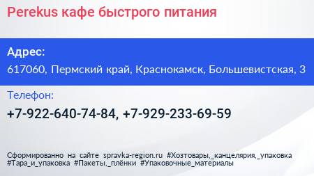 Perekus, кафе быстрого питания по адресу 617060, Пермский край, Краснокамск, Большевистская, 3 в дальнейшем Организация, размещена в следующих категориях: