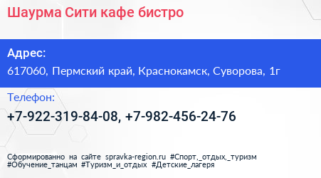 Шаурма Сити, кафе-бистро по адресу 617060, Пермский край, Краснокамск, Суворова, 1г в дальнейшем Организация, размещена в следующих категориях: