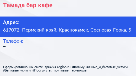 Тамада, бар-кафе по адресу 617072, Пермский край, Краснокамск, Сосновая Горка, 5 в дальнейшем Организация, размещена в следующих категориях: