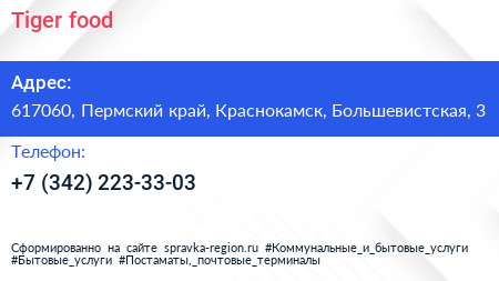 Tiger food по адресу 617060, Пермский край, Краснокамск, Большевистская, 3 в дальнейшем Организация, размещена в следующих категориях: