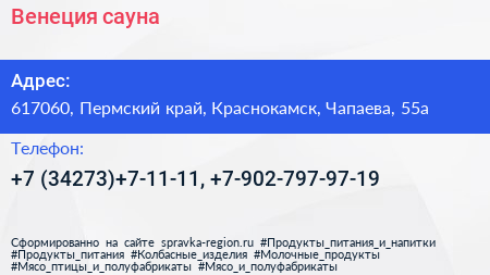 Венеция, сауна по адресу 617060, Пермский край, Краснокамск, Чапаева, 55а в дальнейшем Организация, размещена в следующих категориях: