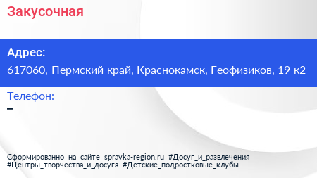 Закусочная по адресу 617060, Пермский край, Краснокамск, Геофизиков, 19 к2 в дальнейшем Организация, размещена в следующих категориях: