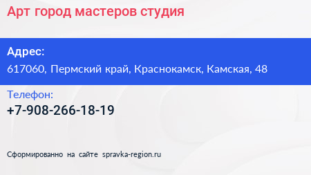 Арт-город мастеров, студия по адресу 617060, Пермский край, Краснокамск, Камская, 48 в дальнейшем Организация, размещена в следующих категориях: