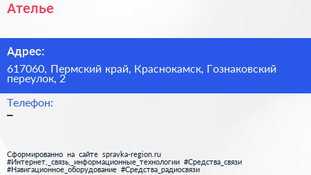 Ателье по адресу 617060, Пермский край, Краснокамск, Гознаковский переулок, 2 в дальнейшем Организация, размещена в следующих категориях: