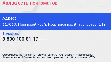 Халва, сеть почтоматов по адресу 617060, Пермский край, Краснокамск, Энтузиастов, 11Б в дальнейшем Организация, размещена в следующих категориях: