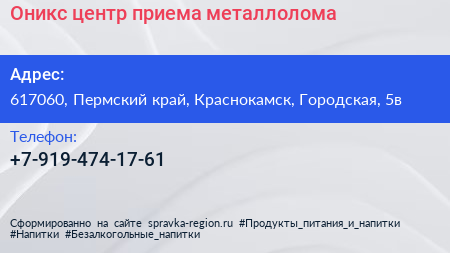 Оникс, центр приема металлолома по адресу 617060, Пермский край, Краснокамск, Городская, 5в в дальнейшем Организация, размещена в следующих категориях: