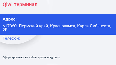 Qiwi, терминал по адресу 617060, Пермский край, Краснокамск, Карла Либкнехта, 2Б в дальнейшем Организация, размещена в следующих категориях: