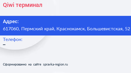 Qiwi, терминал по адресу 617060, Пермский край, Краснокамск, Большевистская, 52 в дальнейшем Организация, размещена в следующих категориях: