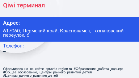 Qiwi, терминал по адресу 617060, Пермский край, Краснокамск, Гознаковский переулок, 6 в дальнейшем Организация, размещена в следующих категориях: