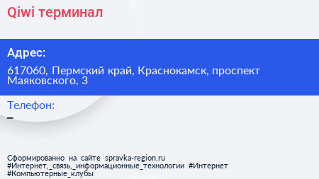 Qiwi, терминал по адресу 617060, Пермский край, Краснокамск, проспект Маяковского, 3 в дальнейшем Организация, размещена в следующих категориях: