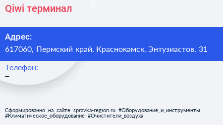 Qiwi, терминал по адресу 617060, Пермский край, Краснокамск, Энтузиастов, 31 в дальнейшем Организация, размещена в следующих категориях: