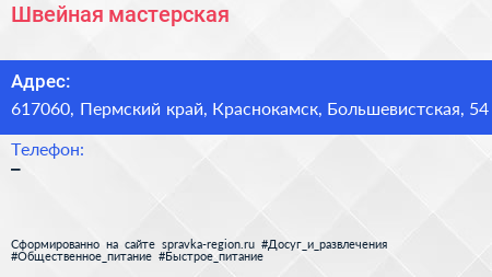 Швейная мастерская по адресу 617060, Пермский край, Краснокамск, Большевистская, 54 в дальнейшем Организация, размещена в следующих категориях: