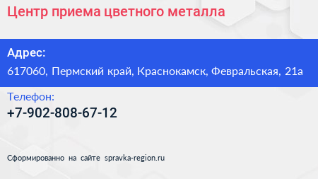 Центр приема цветного металла по адресу 617060, Пермский край, Краснокамск, Февральская, 21а в дальнейшем Организация, размещена в следующих категориях:
