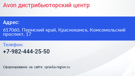 Avon, дистрибьюторский центр по адресу 617060, Пермский край, Краснокамск, Комсомольский проспект, 17 в дальнейшем Организация, размещена в следующих категориях: