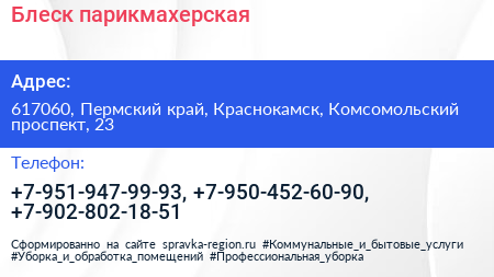 Блеск, парикмахерская по адресу 617060, Пермский край, Краснокамск, Комсомольский проспект, 23 в дальнейшем Организация, размещена в следующих категориях: