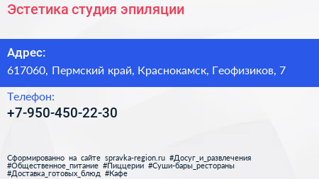 Эстетика, студия эпиляции по адресу 617060, Пермский край, Краснокамск, Геофизиков, 7 в дальнейшем Организация, размещена в следующих категориях: