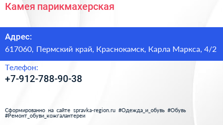 Камея, парикмахерская по адресу 617060, Пермский край, Краснокамск, Карла Маркса, 4/2 в дальнейшем Организация, размещена в следующих категориях: