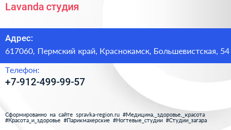 Lavanda, студия по адресу 617060, Пермский край, Краснокамск, Большевистская, 54 в дальнейшем Организация, размещена в следующих категориях: