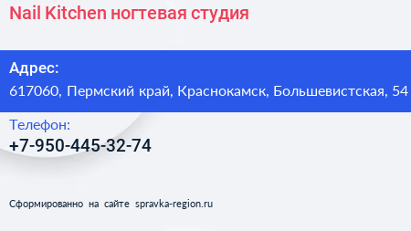 Nail Kitchen, ногтевая студия по адресу 617060, Пермский край, Краснокамск, Большевистская, 54 в дальнейшем Организация, размещена в следующих категориях: