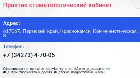 Практик, стоматологический кабинет по адресу 617067, Пермский край, Краснокамск, Коммунистическая, 8 в дальнейшем Организация, размещена в следующих категориях: