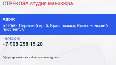 СТРЕКОЗА, студия маникюра по адресу 617060, Пермский край, Краснокамск, Комсомольский проспект, 8 в дальнейшем Организация, размещена в следующих категориях: