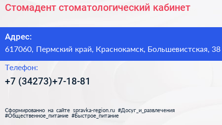 Стомадент, стоматологический кабинет по адресу 617060, Пермский край, Краснокамск, Большевистская, 38 в дальнейшем Организация, размещена в следующих категориях:
