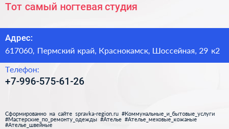 Тот самый, ногтевая студия по адресу 617060, Пермский край, Краснокамск, Шоссейная, 29 к2 в дальнейшем Организация, размещена в следующих категориях: