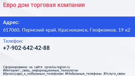 Евро дом, торговая компания по адресу 617060, Пермский край, Краснокамск, Геофизиков, 19 к2 в дальнейшем Организация, размещена в следующих категориях: