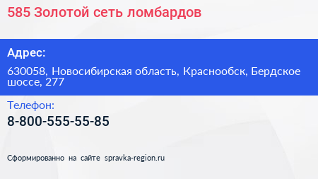 585 Золотой, сеть ломбардов по адресу 630058, Новосибирская область, Краснообск, Бердское шоссе, 277 в дальнейшем Организация, размещена в следующих категориях:
