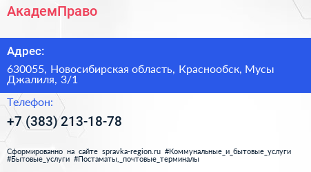 АкадемПраво по адресу 630055, Новосибирская область, Краснообск, Мусы Джалиля, 3/1 в дальнейшем Организация, размещена в следующих категориях: