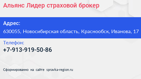 Альянс-Лидер, страховой брокер по адресу 630055, Новосибирская область, Краснообск, Иванова, 17 в дальнейшем Организация, размещена в следующих категориях: