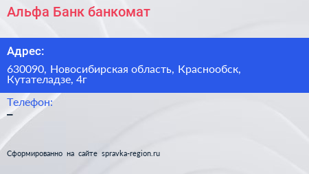 Альфа-Банк, банкомат по адресу 630090, Новосибирская область, Краснообск, Кутателадзе, 4г в дальнейшем Организация, размещена в следующих категориях: