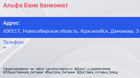 Альфа-Банк, банкомат по адресу 630117, Новосибирская область, Краснообск, Демакова, 3 в дальнейшем Организация, размещена в следующих категориях: