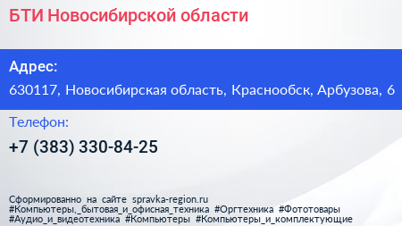 БТИ Новосибирской области по адресу 630117, Новосибирская область, Краснообск, Арбузова, 6 в дальнейшем Организация, размещена в следующих категориях: