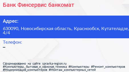Банк Финсервис, банкомат по адресу 630090, Новосибирская область, Краснообск, Кутателадзе, 4/4 в дальнейшем Организация, размещена в следующих категориях: