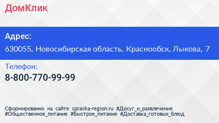 ДомКлик по адресу 630055, Новосибирская область, Краснообск, Лыкова, 7 в дальнейшем Организация, размещена в следующих категориях:
