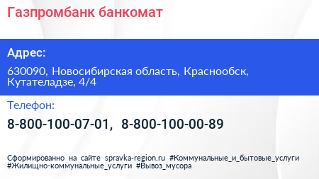 Газпромбанк, банкомат по адресу 630090, Новосибирская область, Краснообск, Кутателадзе, 4/4 в дальнейшем Организация, размещена в следующих категориях:
