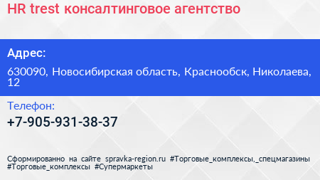 HR-trest, консалтинговое агентство по адресу 630090, Новосибирская область, Краснообск, Николаева, 12 в дальнейшем Организация, размещена в следующих категориях: