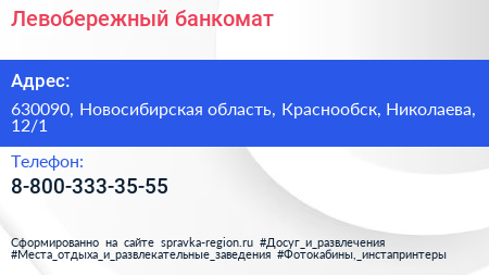 Левобережный, банкомат по адресу 630090, Новосибирская область, Краснообск, Николаева, 12/1 в дальнейшем Организация, размещена в следующих категориях: