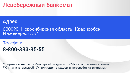Левобережный, банкомат по адресу 630090, Новосибирская область, Краснообск, Инженерная, 5/1 в дальнейшем Организация, размещена в следующих категориях: