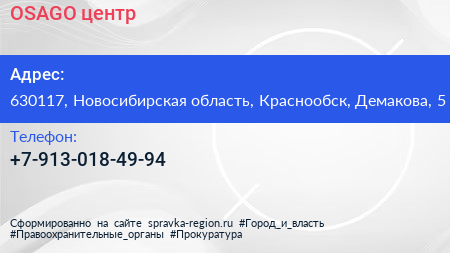 OSAGO центр по адресу 630117, Новосибирская область, Краснообск, Демакова, 5 в дальнейшем Организация, размещена в следующих категориях: